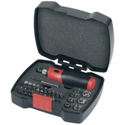 Setul contine 28 piese pentru insurubat (biti si tubulare), surubelnita cu clichet, cutie.