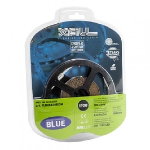 Banda flexibila cu LED-uri Arelux Xfill cu lumina albastra, are o lungime de 3 metri, o putere totala de 18W (6W/m) si un flux luminos total de 840 lm. Alimentatorul, cablul de alimentare cu intrerupator pe fir si stecherul sunt incluse.