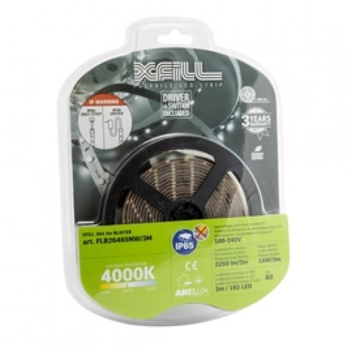 Banda flexibila cu LED-uri Arelux Xfill detine invelis anti UV din silicon, fiind protejata la praf si umiditate (IP65). Aceasta are o lungime de 3 metri, o putere totala de 18W (6W/m) si un flux luminos total de 2250lm. Alimentatorul (grad de protectie IP20), cablul de alimentare cu intrerupator pe fir (grad de protectie IP20) si stecherul sunt incluse.