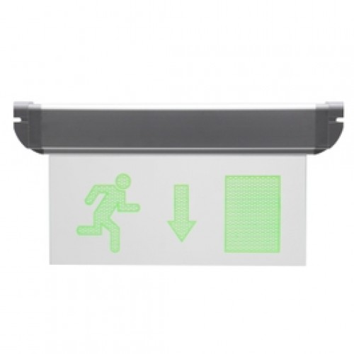 Corpul de evacuare cu sageata jos poate fi montat pe perete, pe tavan sau agatat si are dimensiunile de 160 x 315 mm.