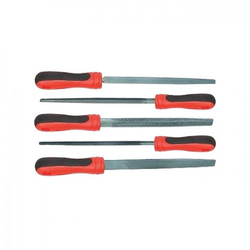 Rugozitate 2, lungime 250 mm. Material otel calit (60HRC). Maner PP cu cauciuc inmuiat PTR. Contine: pila lata, pila semi-rotunda, pila triunghiulara, pila patrata, pila rotunda. Greutate 0,95 kg